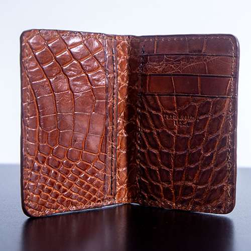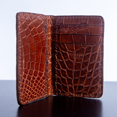 Discover the ultimate balance of sophistication and practicality with our Premium Wild Alligator Front Pocket Wallet in Cognac. Hand-crafted in Melbourne, Florida by Taza Leather, this slim wallet is designed for the modern gentleman who values elegance, durability, and convenience.